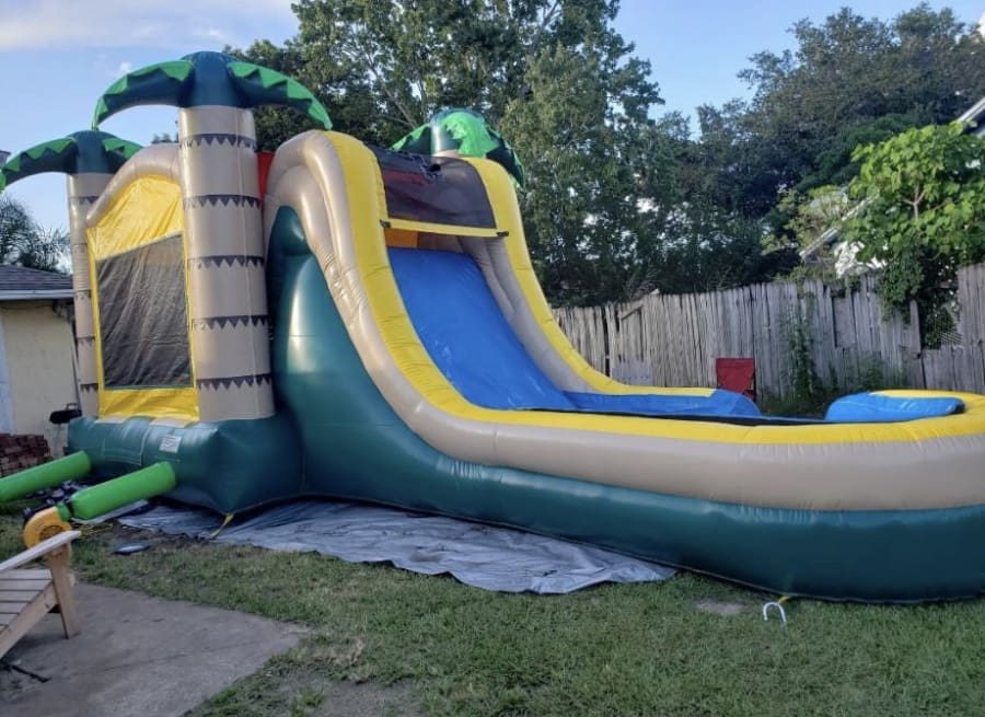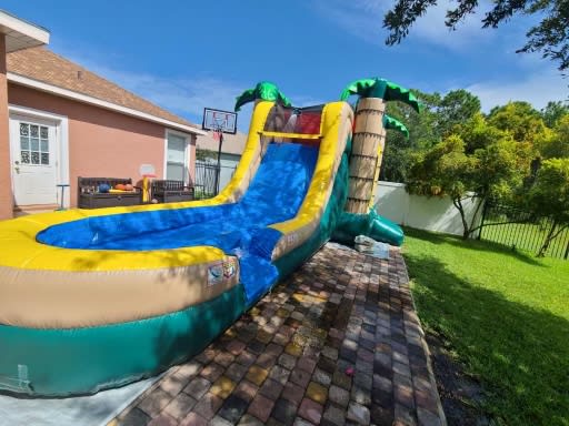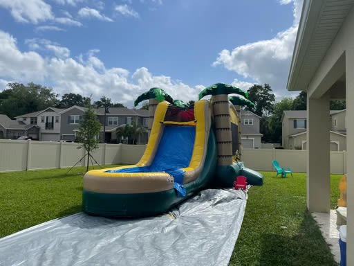 Palm Bounce and slide is a wet dry combo. This slide and bounce house is big enough for the big kids and not too big for the little kids. Play all day and into the night if you wanted. Overnight rentals available.