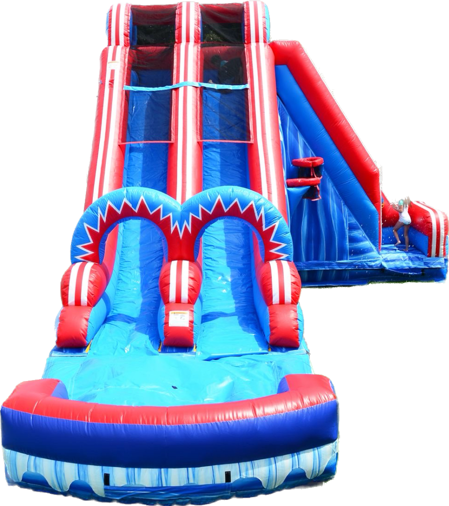 Get ready for an epic adventure with our Dual Patrioteer Inflatable Waterslide, available for rent in Oviedo, Winter Park, Geneva, Ocoee, Winter Garden, and many more areas. This impressive 23-foot-tall dual lane water slide features a vibrant red, white, and blue design that is perfect for all ages, from kids to teens to adults.