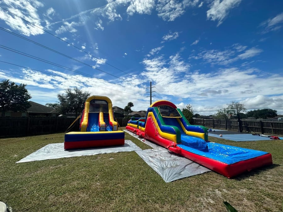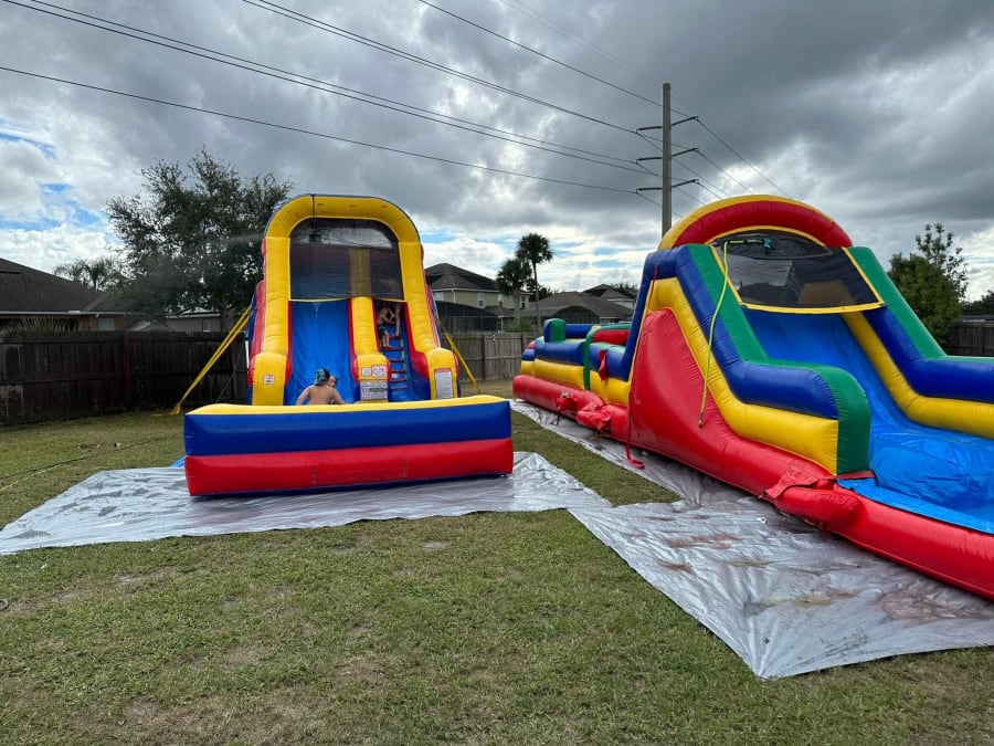 2 Piece obstacle with wide slide and an additional BIG Slide that matches. Take your party to the next level all while saving big bucks with you rent this package. Bright, New and all the fun one cam ask for. Great for parties, events, schools and churches.
